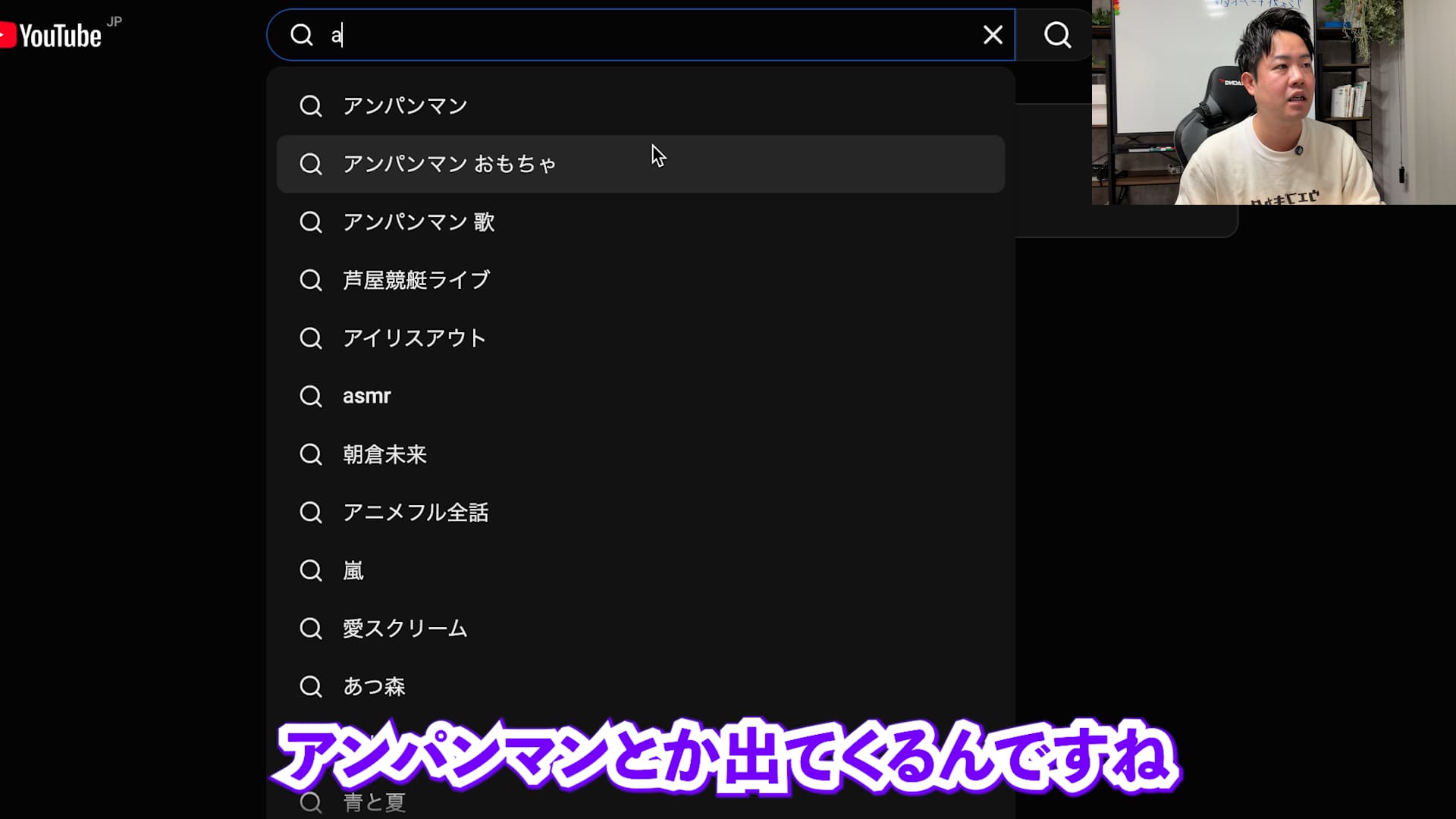 面白いことに、プラットフォームによって検索されるニーズは異なります。例えばYouTubeで「a」と打つと、アニメの「アンパンマン」などが候補に出てくることがあります。