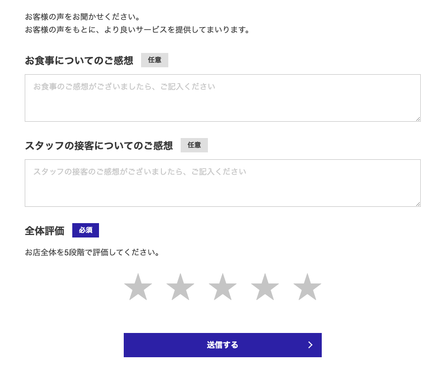 Googleアカウント(Gmailアドレスなど)をお持ちでない場合は、Googleマップへ投稿ができません。そういったお客様にもアンケート段階でフィードバックをいただくことで、サービス改善に役立つ生の声を収集できます。