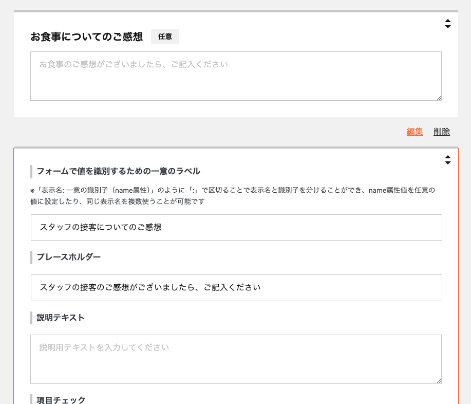 「評価(星1〜5)」「コメント」「連絡先」など、欲しい項目を自由に追加・削除できます。これにより、お店ごとに必要な情報を効率的に収集しやすくなります。