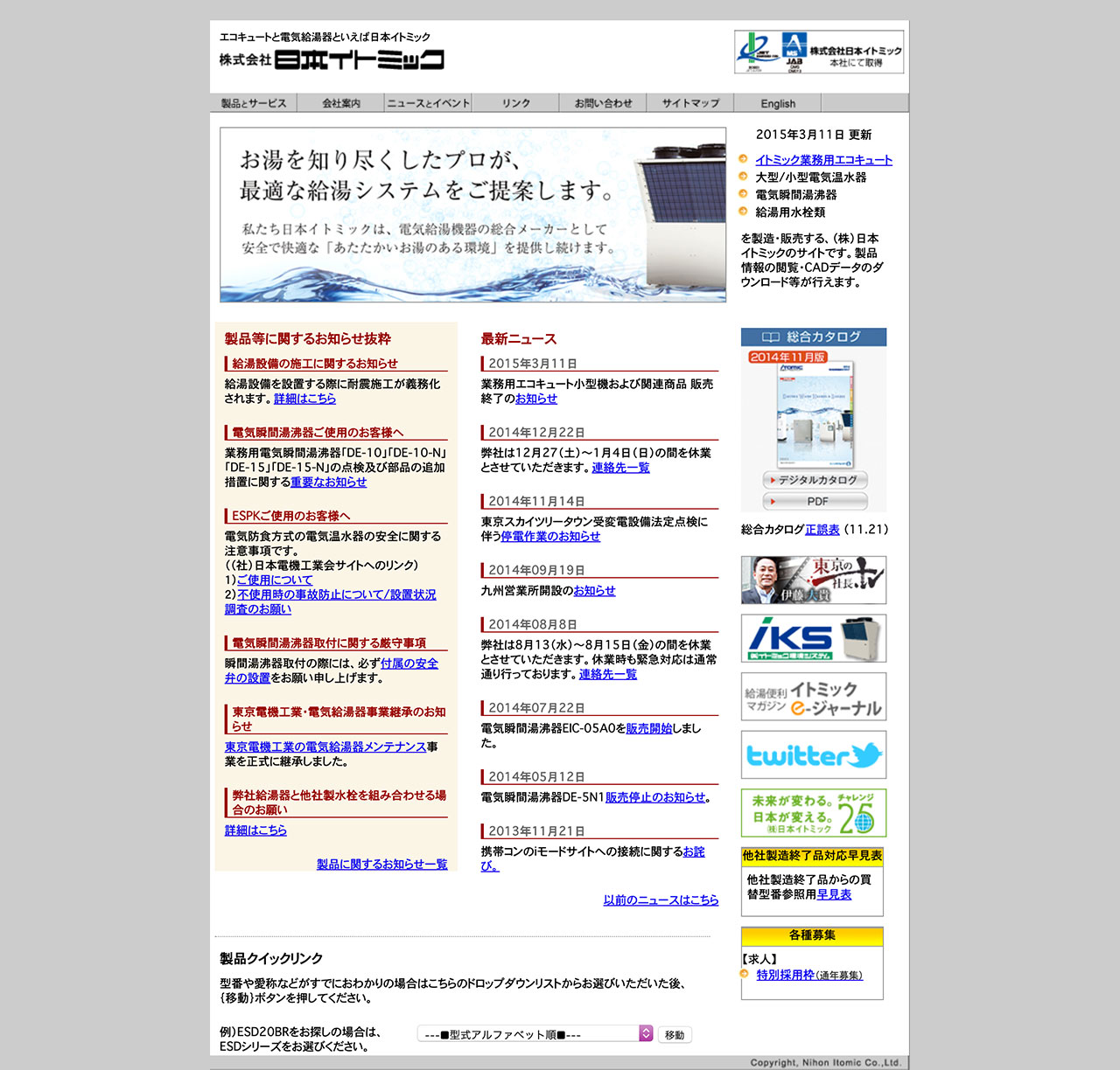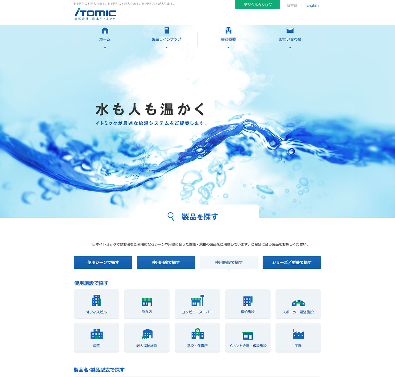 電気給湯器のパイオニアである株式会社日本イトミック様のホームページをリニューアルさせていただきました。ホームページを閲覧することが予想されるユーザーが、「施工会社」「設計者」「エンドユーザー」など様々である日本イトミック様。製品を探しやすいようにしつつ、エンドユーザーにもブランディングを仕掛けられるようなページ構成になっています。製品検索も、単純に製品番号を入力するだけでなく、製品をあまりしらないユーザーも探しやすいように「利用用途」や「設置施設」などから製品を探せるようにも設定しています。また、英語版や中国語版のホームページについても作成しています。
