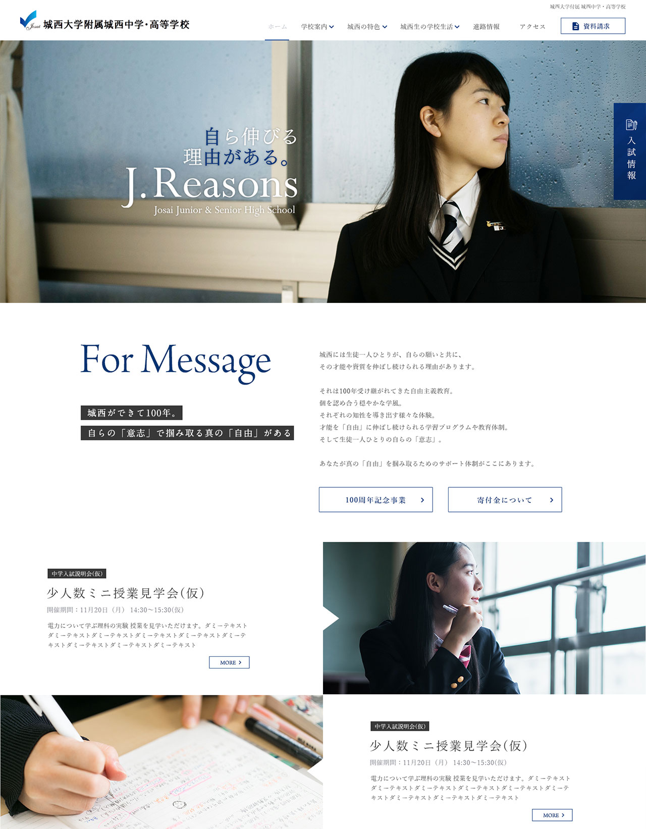 100年の歴史を持つ、中高一貫の学校である、学校法人城西学園様からホームページリニューアルのご依頼をいただきました。開校から100周年というタイミングで、あえて学校法人の制作経験のあまりない企業としてご指名してくださいました。「学校専門」という業者ではなく、企業集客の最前線で培ったノウハウを城西学園のPRに活かしてほしいというご要望でした。