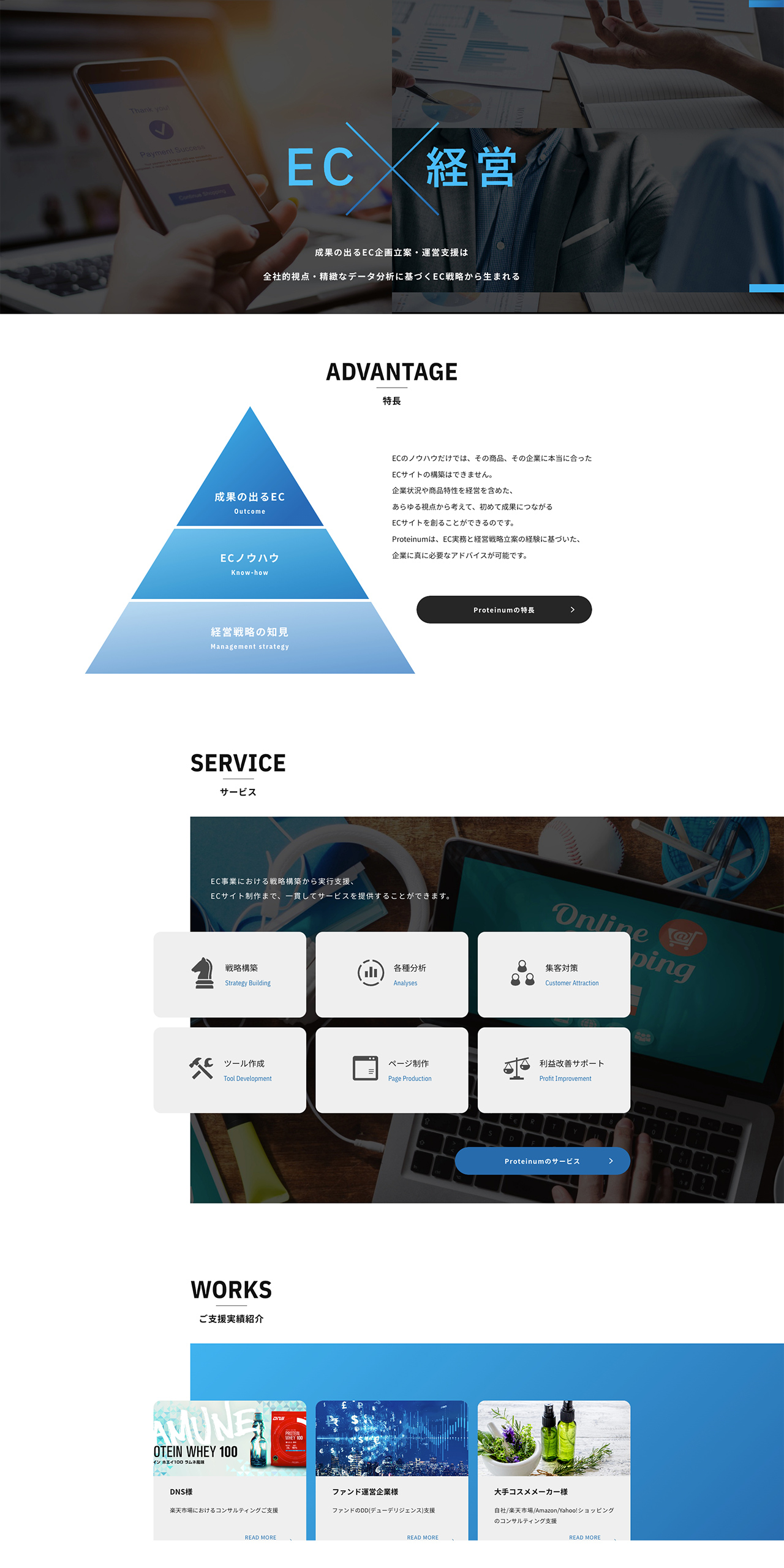 サービス内容を細分化し、ユーザーが求める情報にスムーズにアクセスできるようにしました。トップページにはクライアント様のロゴや事例を紹介し、信頼性をアピールしています。サービス一覧ページはLP(ランディングページ)のような見た目にすることで、ユーザーに 一目でサービスの魅力を伝え、行動を促すようなデザインになっています。